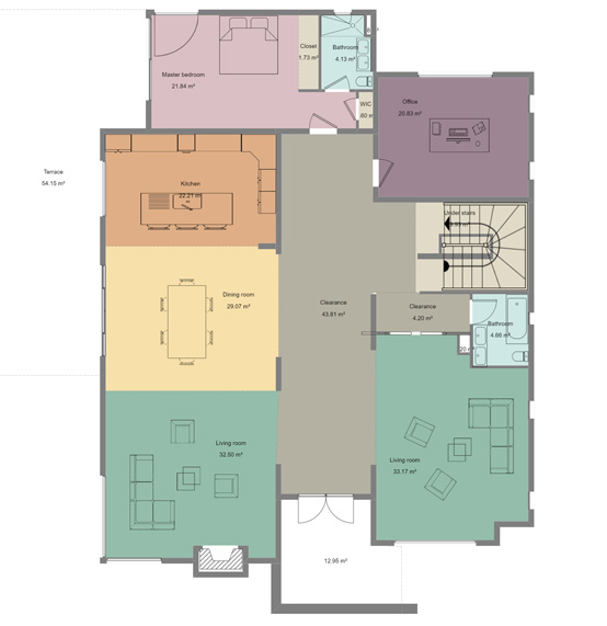 En 2D, los planos muestran de manera útil las longitudes de las paredes, el área superficial y otras medidas. Muestran la distribución general de la vivienda sin proporcionar demasiados detalles que distraigan visualmente. Sin embargo, los planos en 2D pueden volverse bastante complejos si eliges utilizar símbolos para representar elementos como muebles y decoraciones.