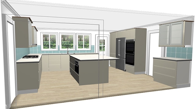 - Design library with 1,000s of objects, including kitchen islands, and cabinets